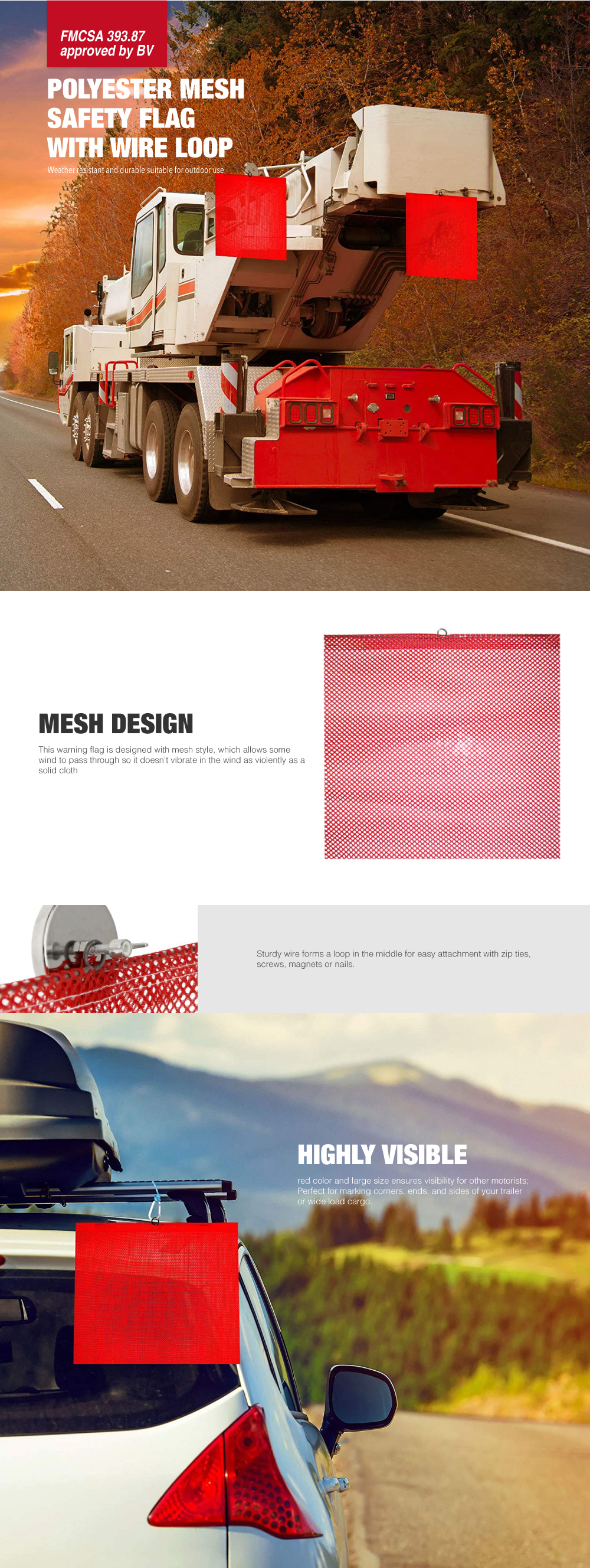 FMCSA 393.87 approved 18 x 18 Inches/24 x 24 Inches Polyester Mesh Safety Flag with Wire Loop