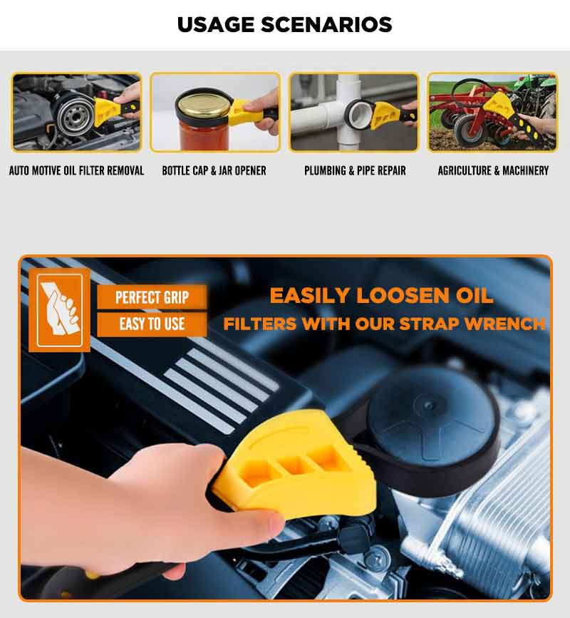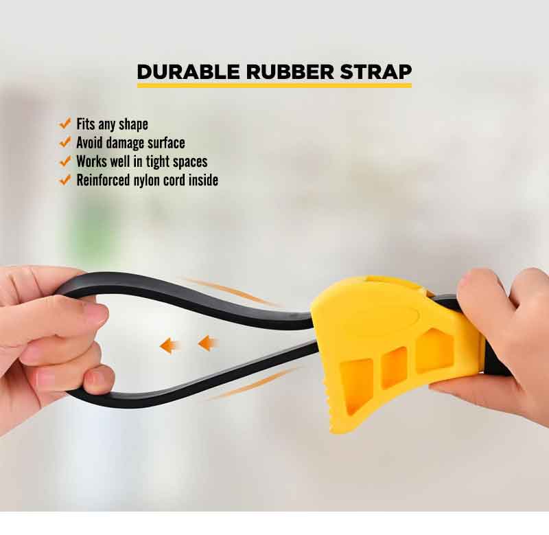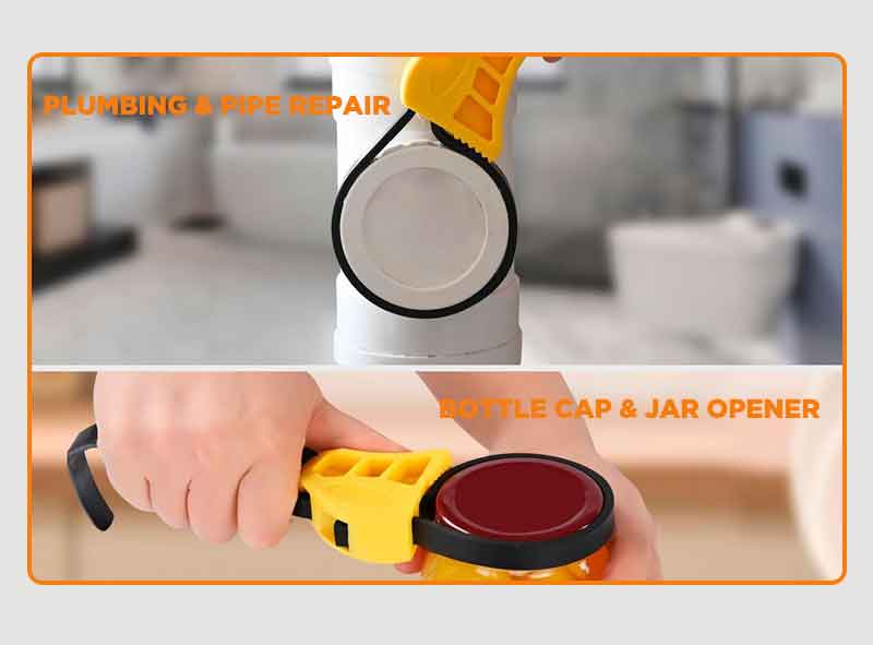 Effortless Opening: The rubber strap wrench is expertly designed to twist off stubborn jar lids with minimal effort, making it an essential jar opener. This versatile tool functions as a pipe wrench, oil filter wrench, and adjustable wrench, providing unmatched grip and control for all your needs Widely Used Applications: Rubber strap wrench are widely used in a variety of applications, such as automotive, agriculture, tractor, oil filter, glue joint, shower heads, fuel filter, bottle opener, PVC joint, faucet, water filters, sink, tap and more