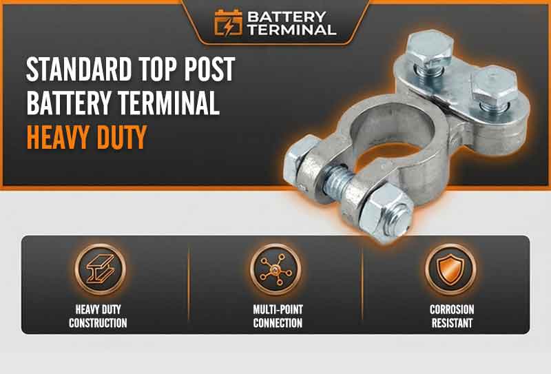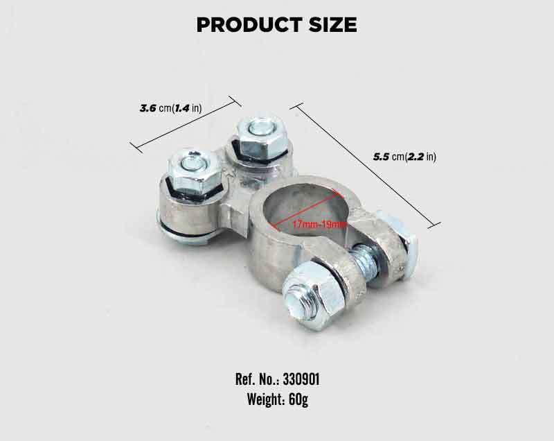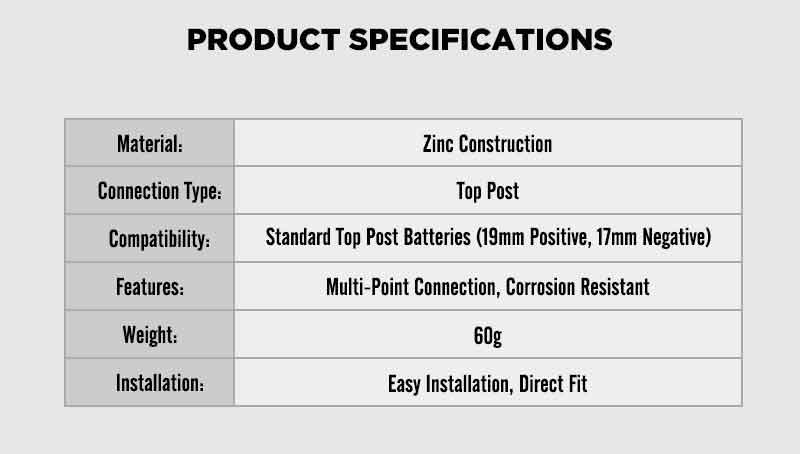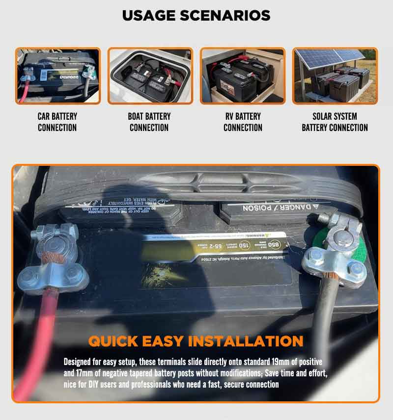 Compatible With 6v 12v Batteries: these battery terminals work with both positive and negative posts, compatible with 6V and 12V top side post batteries; No need to worry about polarity, just install and enjoy a stable, high conductivity connection for cars, RVs, marine, and more Quick Easy Installation: designed for easy setup, these terminals slide directly onto standard 19mm of positive and 17mm of negative tapered battery posts without modifications; Save time and effort, nice for DIY users and professionals who need a fast, secure connection Compatible with Most Standard Vehicles: fits cars, trucks, RVs, boats, ATVs, and other vehicles with standard top post batteries; Whether for daily driving or marine use, these terminals ensure a stable, performance electrical connection