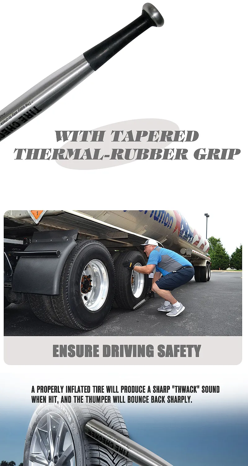 Tire Checker - Corrosion resistant heavy-duty aluminum 'billy' bat with tapered thermal-rubber grip and a wrist-strap that doubles as a storage hanger. - A properly inflated tire will produce a sharp "thwack" sound when hit