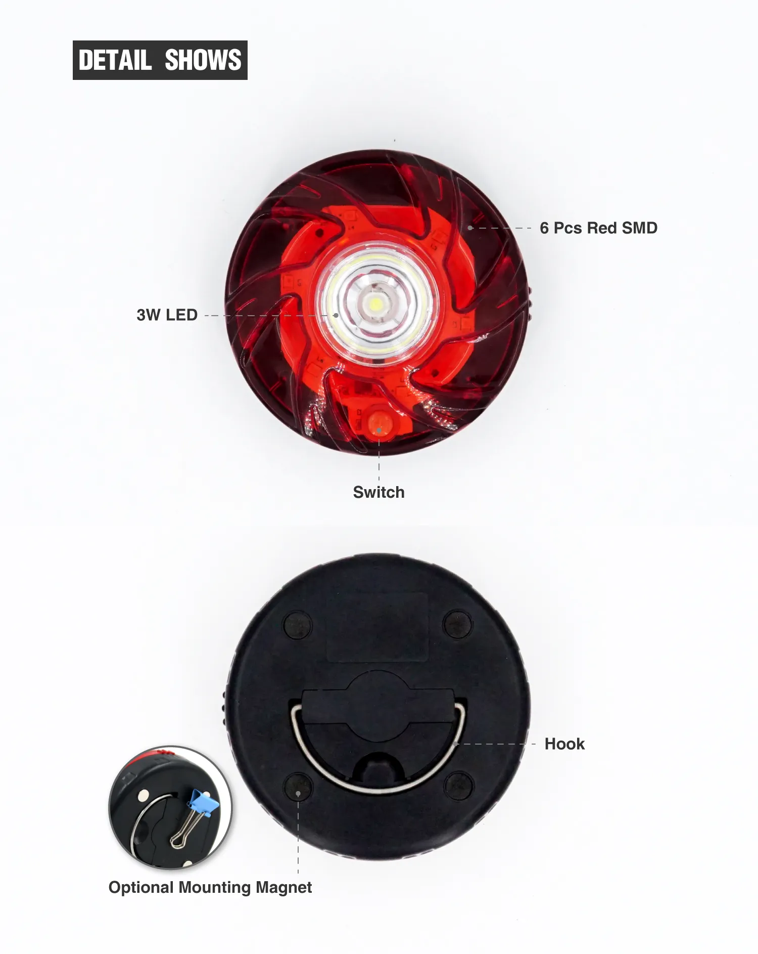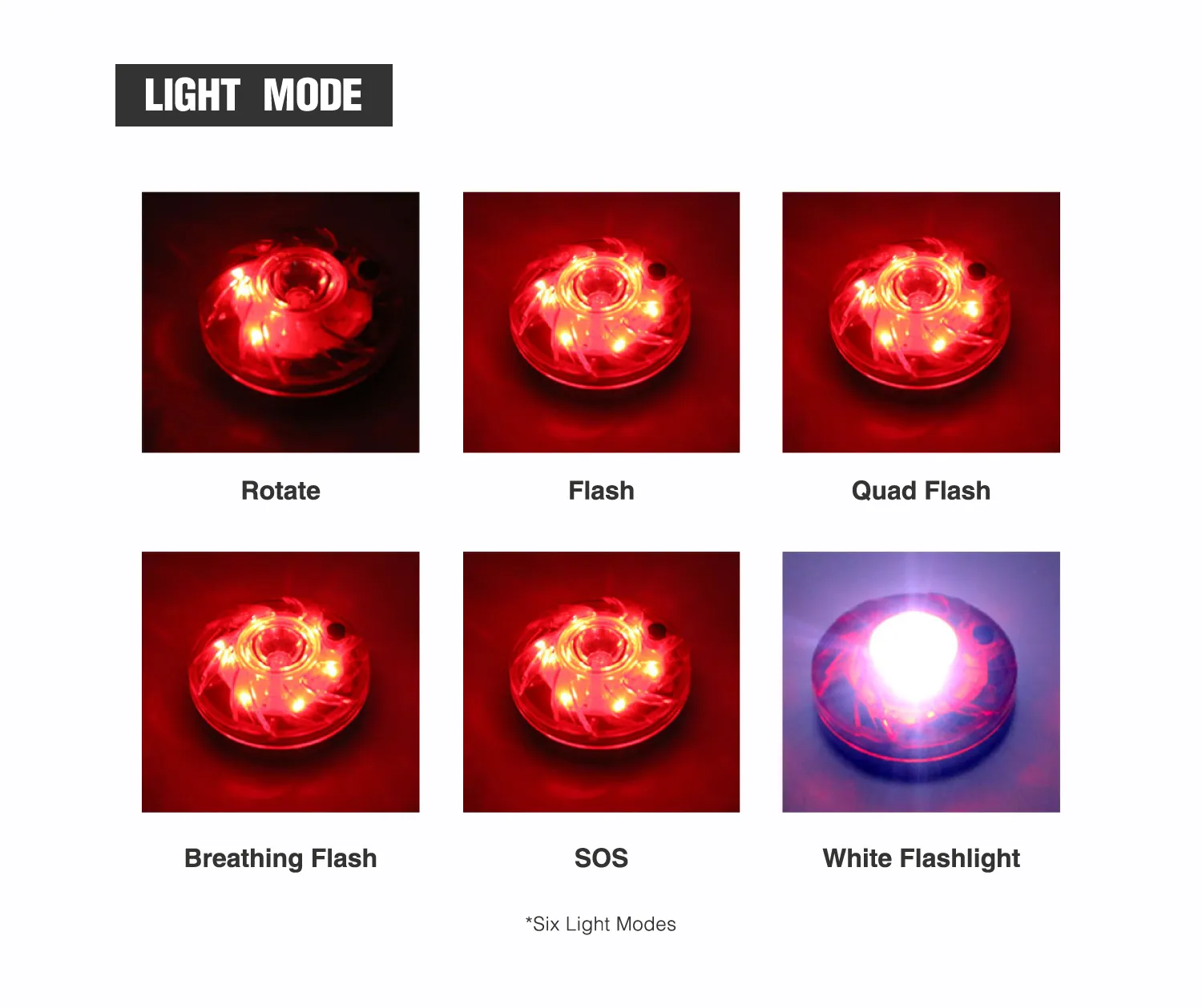Six modes: Rotate,Flash, Quad Flash, Breathing Flash, SOS, White flashlight on the top