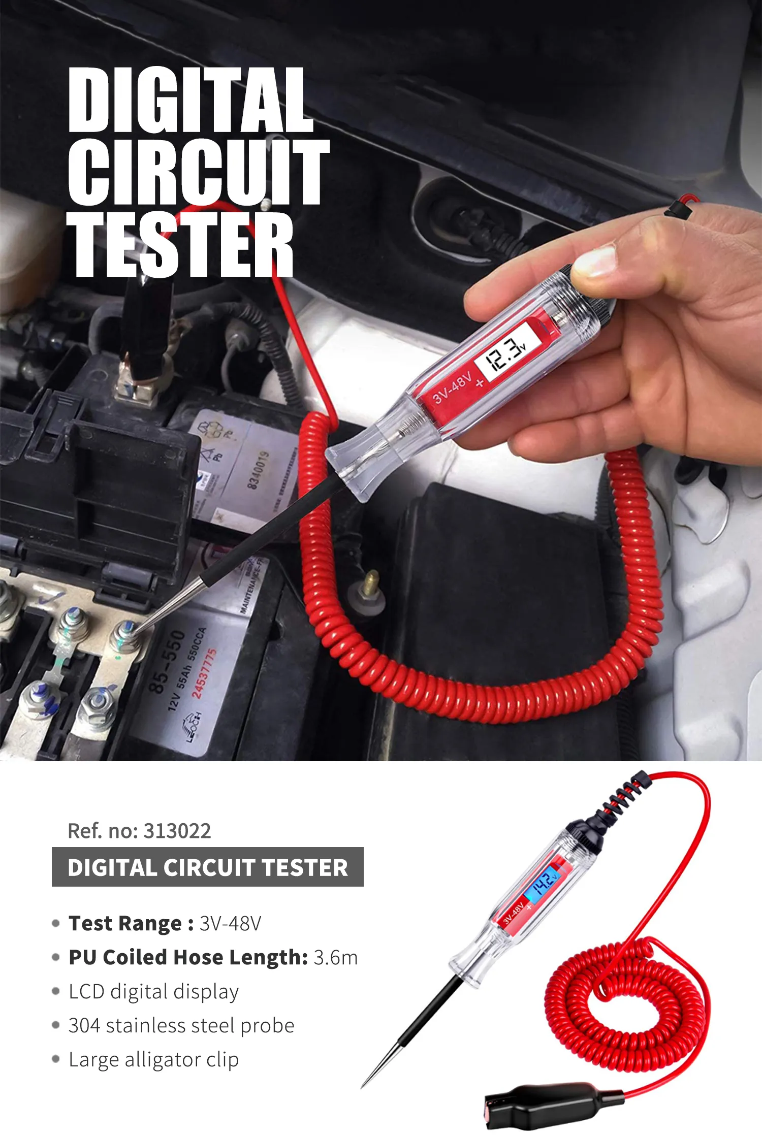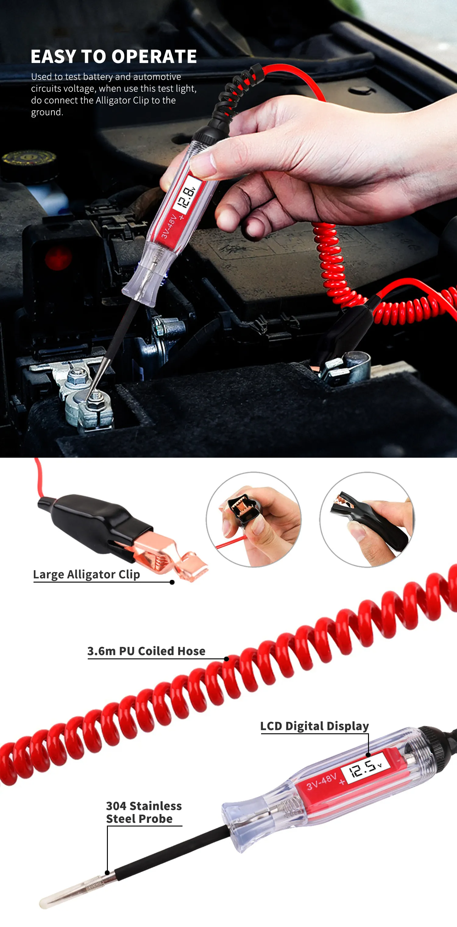 Heavy Duty 3-48V Backlit Digital LCD Circuit Tester With 140 Inches Extended Spring Wire