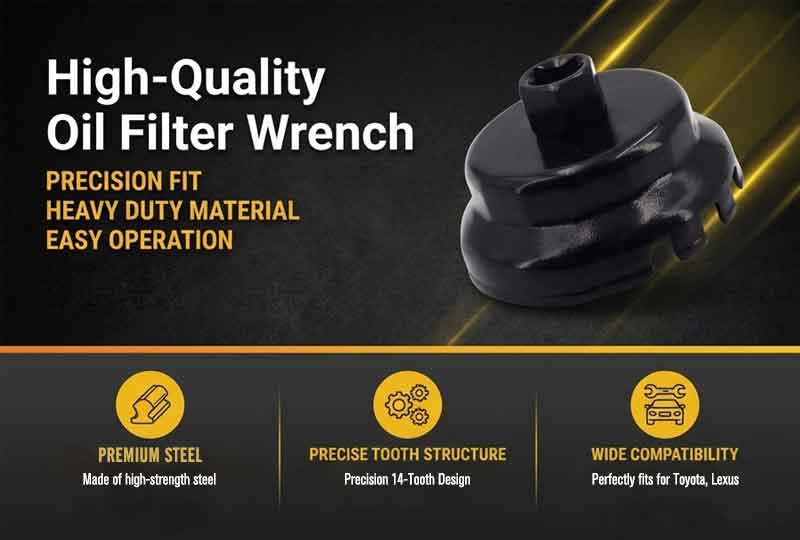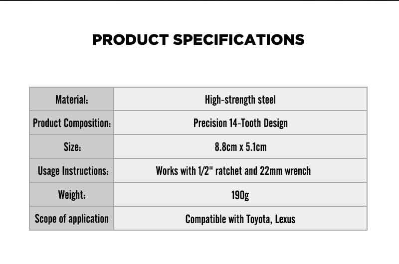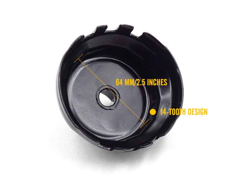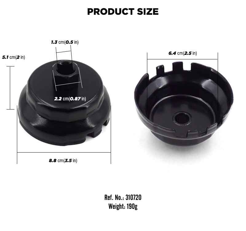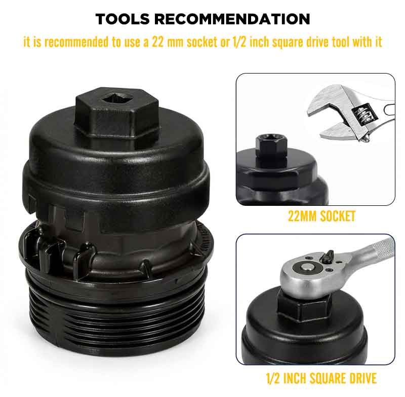 Function : The interior of this filter element wrench adopts a precisely toothed structure, which can tightly engage with the filter element. During disassembly and installation, it can effectively prevent slipping and damage, and operate flexibly even in the narrow space of the engine compartment Scope of application : This oil change tool is compatible with Lexus ES300h 2.5L 2013-2015, for Lexus GS350 3.5L 2007-2015, for Lexus GS450h 3.5L 2007-2015, for Scion TC 2.5L 2011-2015, for Toyota 4-Runner 4.0L 2010-2015, for Toyota Sequoia 4.6L 2010-2012, for Toyota Tundra 4.0L 2014 and other models Instructions for use : This heavy duty oil filter cap is easy to install. It is recommended to use a 1/2-inch (13mm) ratchet wrench or a 22mm wrench. Just install the wrench on the filter cap and apply a gentle force to complete the disassembly or installation, effectively saving your time Product Introduction : This product includes 1 oil filter removal tool. The product size is 8.8x5.1cm, with 14 slots and an inner diameter of 64mm, which can meet your daily use.