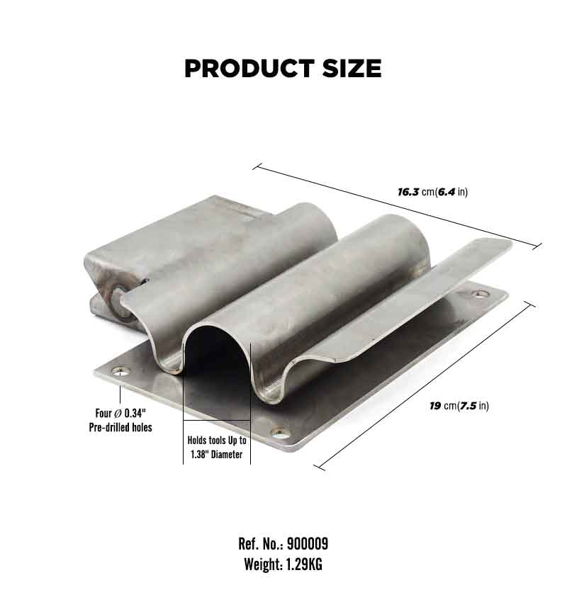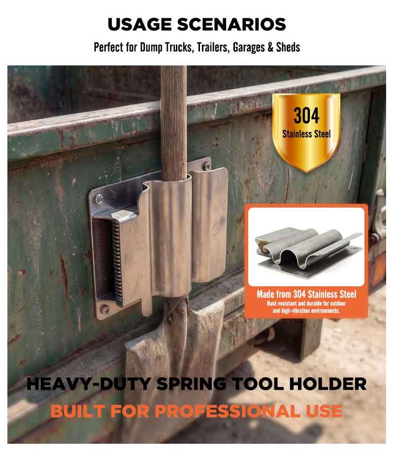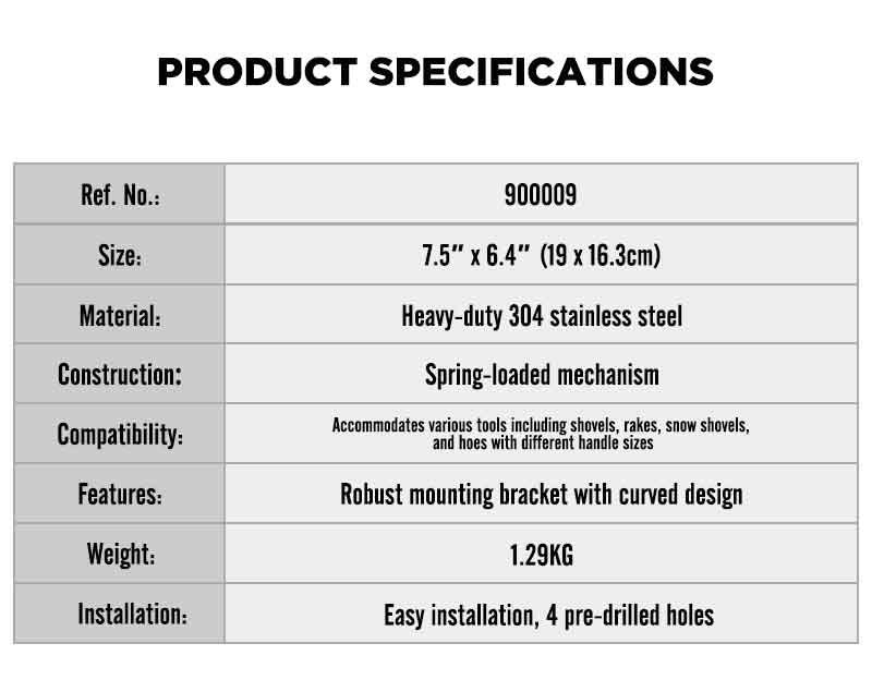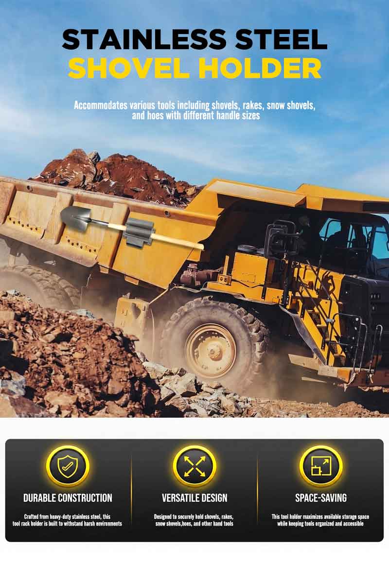VERSATILE MOUNTING: Pre-drilled holes allow for quick installation on dump trucks, trailers, or other equipment surfaces MULTI-TOOL COMPATIBILITY: Accommodates various tools including shovels, rakes, snow shovels, and hoes with different handle sizes PRACTICAL DIMENSIONS: Robust mounting bracket with curved design provides secure grip while protecting tool handles from damage