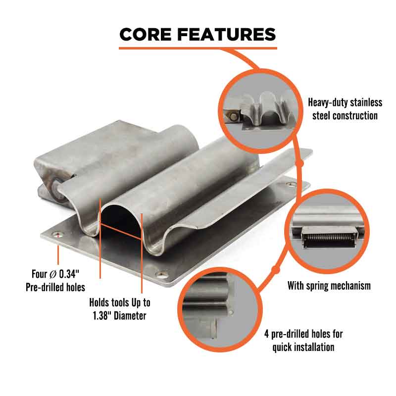 SPRING-LOADED DESIGN: Heavy-duty stainless steel construction with spring-loaded mechanism for secure tool retention and easy access