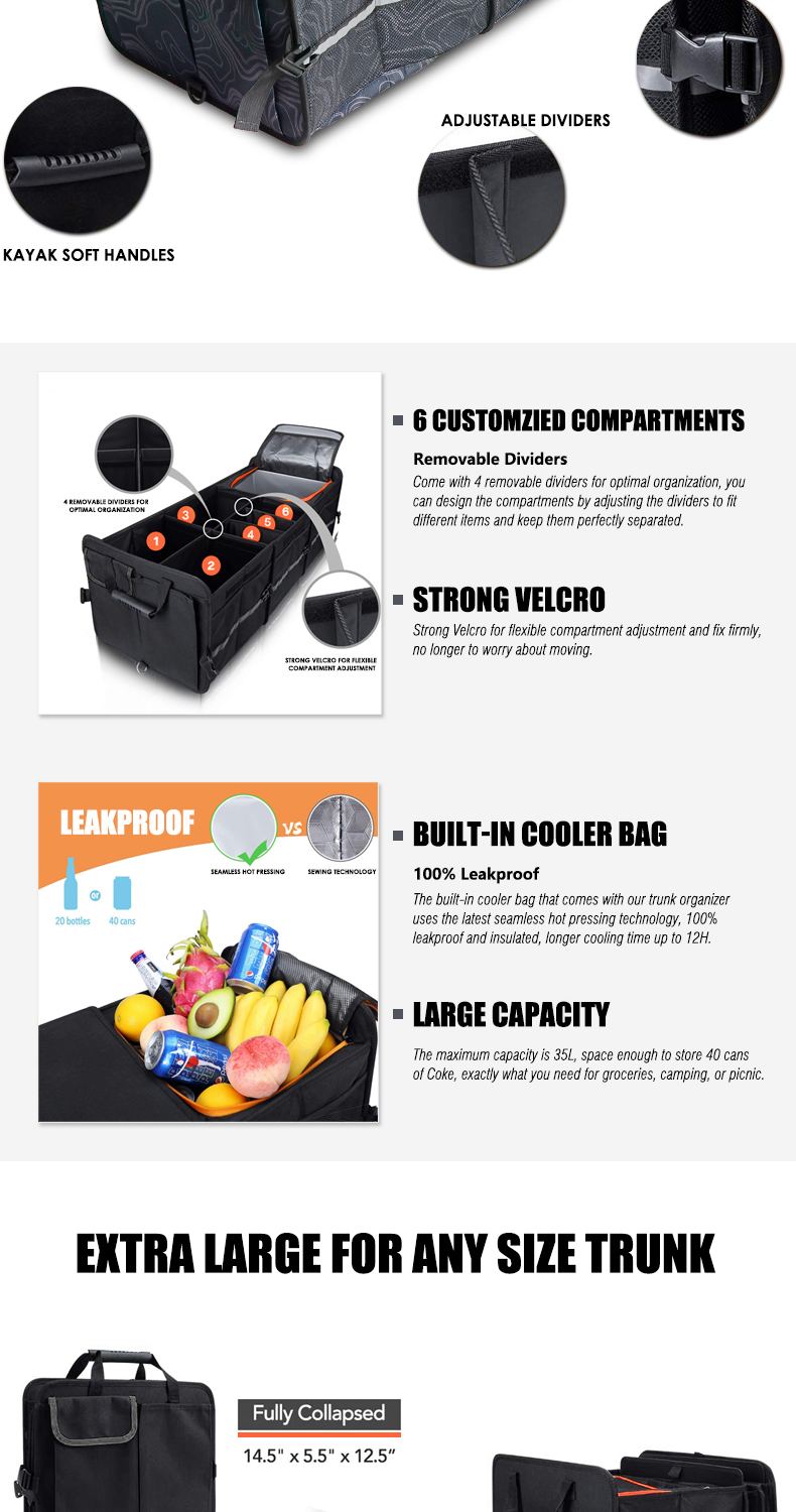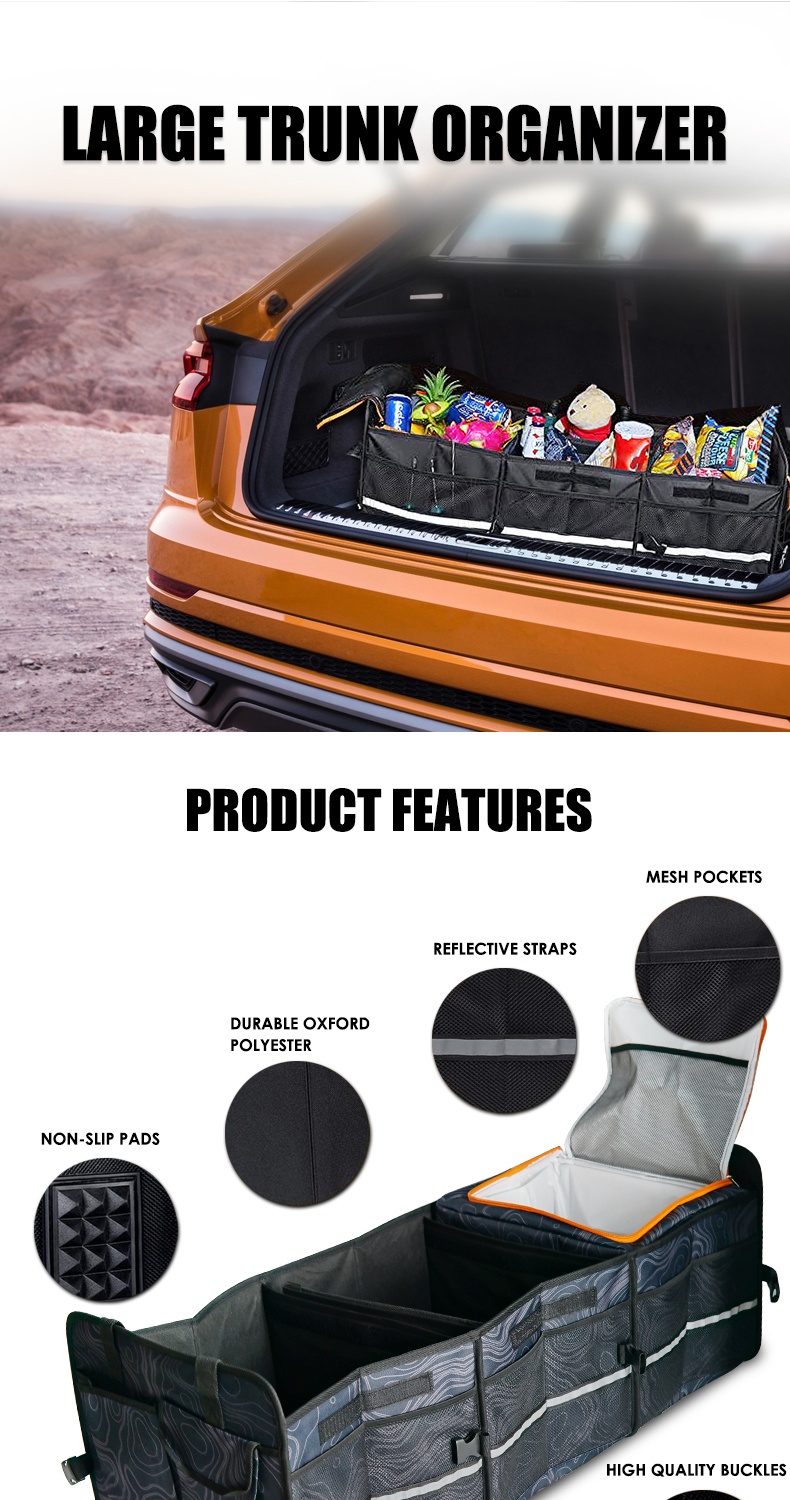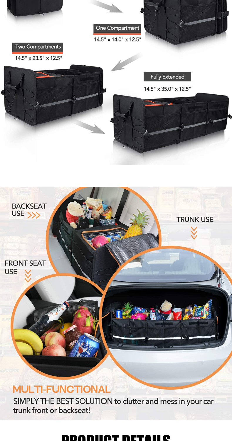 Trunk Organizer With Reflective Stripe For Car 3 Large Compartments Foldable Waterproof Portable Car Storage Box