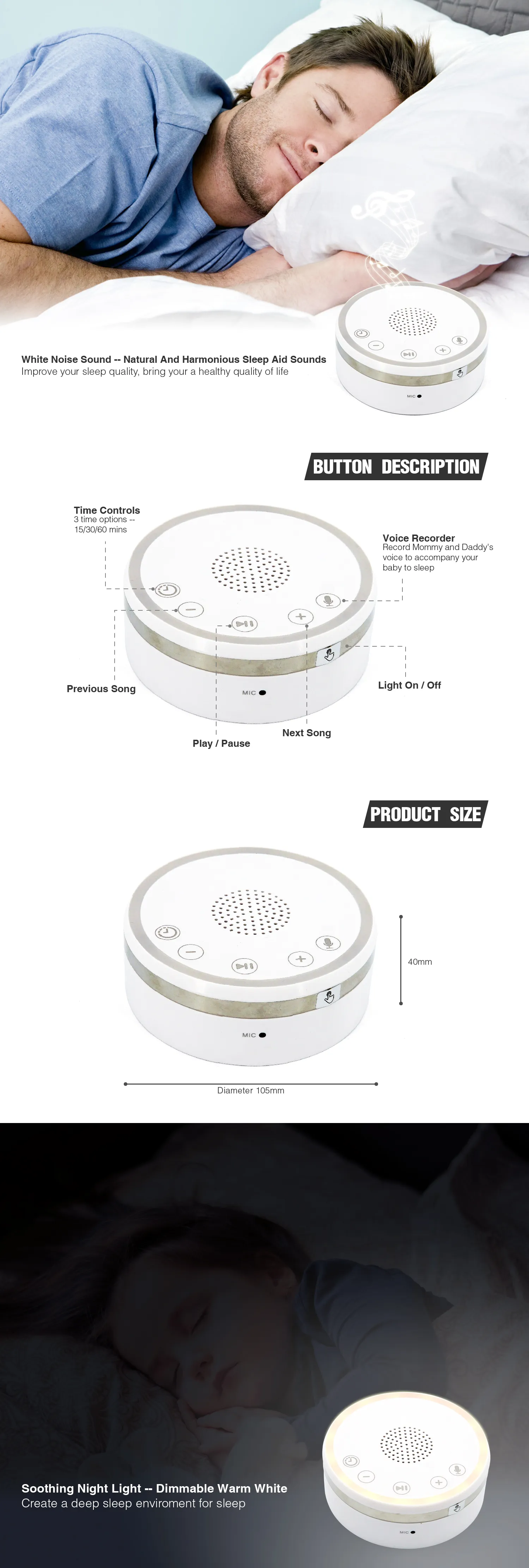 (1) 9 Non-Looping Natural Sounds-- white noise, waves, rain sound, waterfall, crickets sound, birdsong and 3 lullaby sounds; (2) 3 timers-- 15/30/60 mins; (3) Soothing Night Light -- dimmable warm white -With a hanger--easy to carry or hang on some where; (4) Battery compartment available -- easy to go through airport; (5) Touch sensitive switch; (6) Voice recorder--record Mommy and Daddy's voice to accompany your baby to sleep